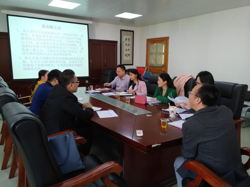 会议上,报告的工作论文分别为《交易型市场操纵的预警指数与监管的研究》(报告人:陈见丽、阮卓)、《我国上市公司的高送转行为对股票超额收益率的影响》(报告人:陈见丽、江帆)以及《盈峰环境收购中联环境案例分析》(报告人:陈见丽、谢晋增),点评人甄丽明博士认为题目是文章之眼,应能在第一时间吸引读者眼球,选题也应注重新颖性,紧扣当下经济背景,她强调论文写作应建立在规范严谨和逻辑紧密的基础之上;点评人赵剑锋博士则在文献理论和样本数据的时效性等方面给出了建议,提出论文写作的前提是了解相关领域的研究新动态,进而起到承上启下作用的观点;与会老师还对技术可行性、案例代表性以及研究视角的巧妙选择等问题进行热烈讨论。