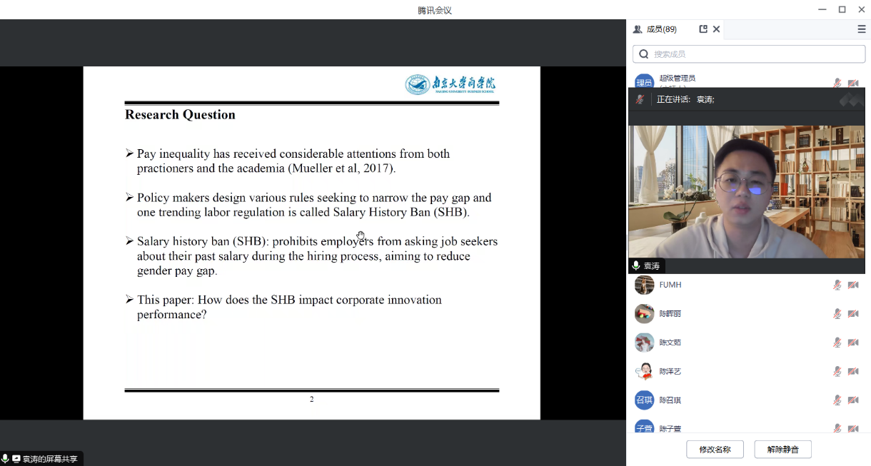 在论文报告环节,袁涛老师首先介绍了美国的薪酬历史禁令(Salary History Ban)及其相关研究,在此基础上探讨薪酬历史禁令的出台对企业创新的影响。研究发现,薪酬历史禁令的出台降低了企业创新水平。进一步的机制分析表明,薪酬历史禁令在减少性别工资差距的同时降低了男性员工工作的积极性,对企业创新活动产生负面影响。此外,薪酬历史禁令的出台可能会加剧就业市场的信息不对称,导致企业在招聘过程中出现 “逆向选择”,降低研发人员的招聘质量。在交流环节,公司师生就论文的异质性检验、结论在国内的适用性以及中介效应方法的使用等学术问题与袁涛老师进行深入的探讨。