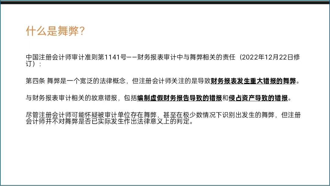 接下来,郭素宏女士引用《中国注册会计师审计准则第1141号——财务报表审计中与舞弊相关的责任》(2022年12月22日修订)的第4条对舞弊的概念定义,并进行解释,也阐释了舞弊的违法性,要求同学们守好法律红线,杜绝舞弊。