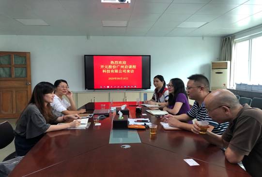 2020年9月16日下午,开元股份广州启课程科技有限公司法人代表、总经理李娟女士和课程事业部李露女士一行来公司交流会计课程建设事宜,tyc122cc太阳成集团文芳经理、舒丽敏副经理、赵剑锋副经理、罗书章主任热情接待了李总经理一行。