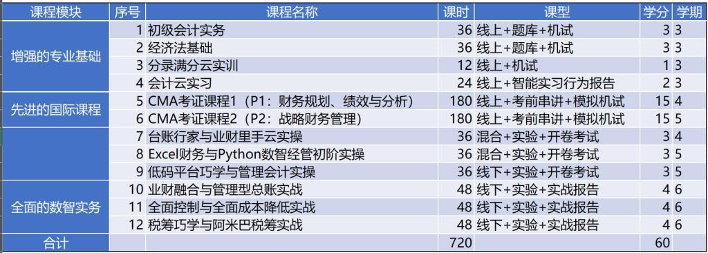 4、授课内容:主要包括“增强的专业基础”、“先进的国际课程”、“扎实的数智技能”和“全面的数智实务”四大部分。课程大纲如下表所示:
