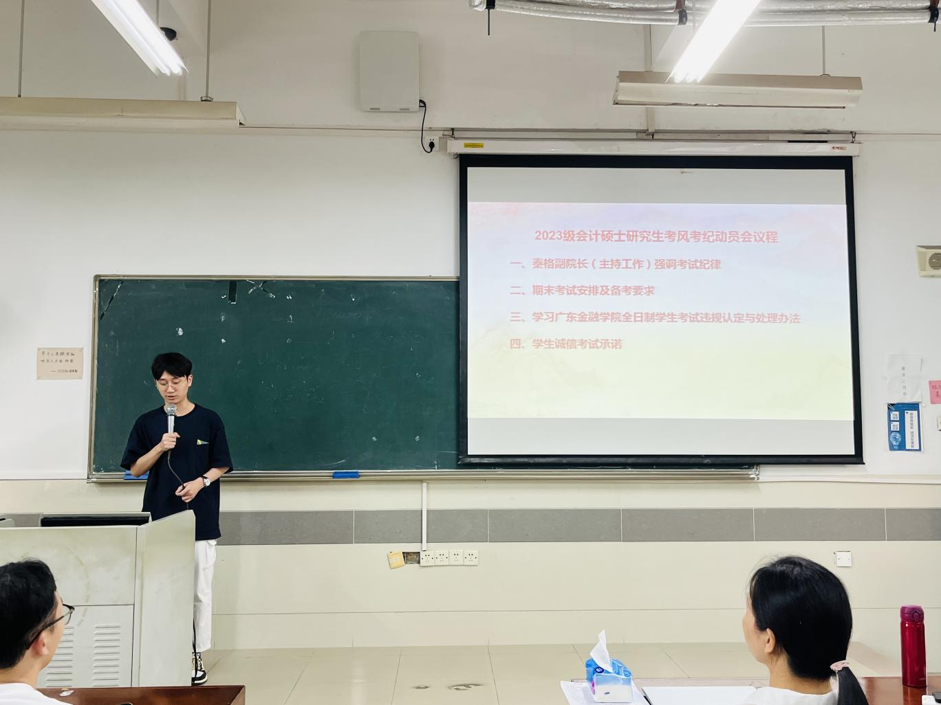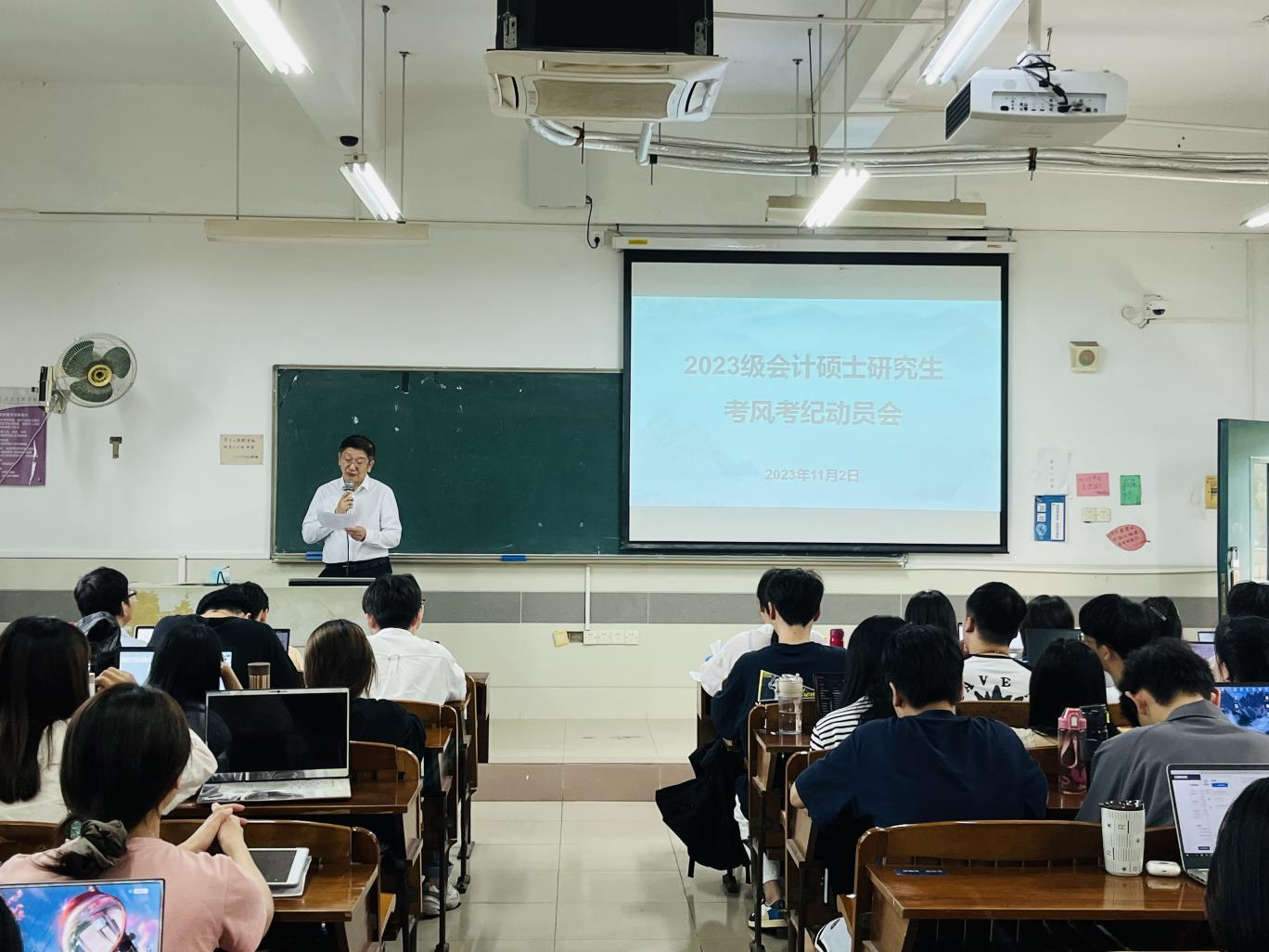 为加强学风建设,严肃考风考纪,tyc122cc太阳成集团于2023年11月2日下午16:30在北教学楼 C-504召开了2023-2024学年第一学期会计硕士研究生考风考纪动员大会。本次会议由秦格副经理主持,舒利敏副经理、辅导员梁小健老师以及2023级全体会计硕士研究生参加了本次会议。