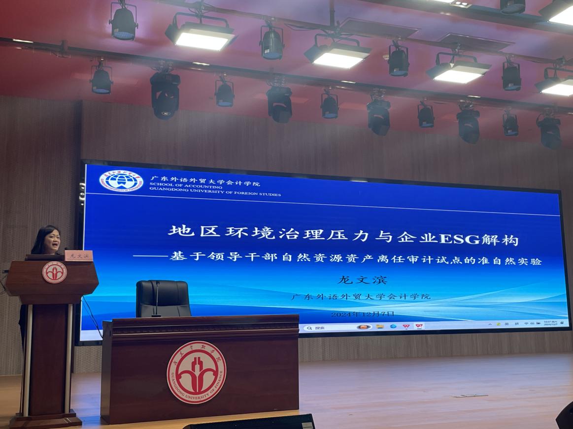 广东省社会责任研究会副秘书长、广东外语外贸大学龙文滨教授以《地区环境治理压力与企业ESG解构》为题,剖析了宏观政策下地方政府环境治理压力的动态变化,并以领导干部自然资源资产离任审计制度为准自然实验场景,论证了地区环境治理压力与企业环境绩效、社会责任绩效及公司治理绩效之间的关系。