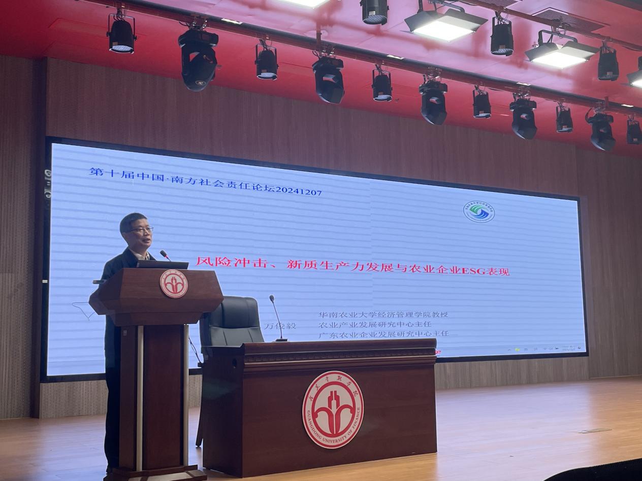 接下来的主题演讲环节,广东省社会责任研究会副会长、华南农业大学万俊毅教授以《风险冲击、新质生产力发展与农业企业ESG表现》为题,分析了风险管理与新质生产力在农业企业ESG实践中的作用以及农业企业ESG信息披露与ESG表现之间的关系。